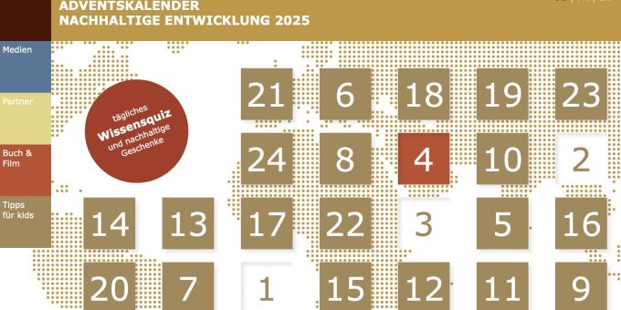 Die Adventszeit ist da! Der Kalender „24 x nachhaltig“ bietet jeden Tag neue Inspirationen für nachhaltige Projekte, die mindestens eines der UN-Nachhaltigkeitsziele unterstützen. Dazu gibt es Geschenkideen, Quiz mit tollen Preisen und Tipps für Kinder.